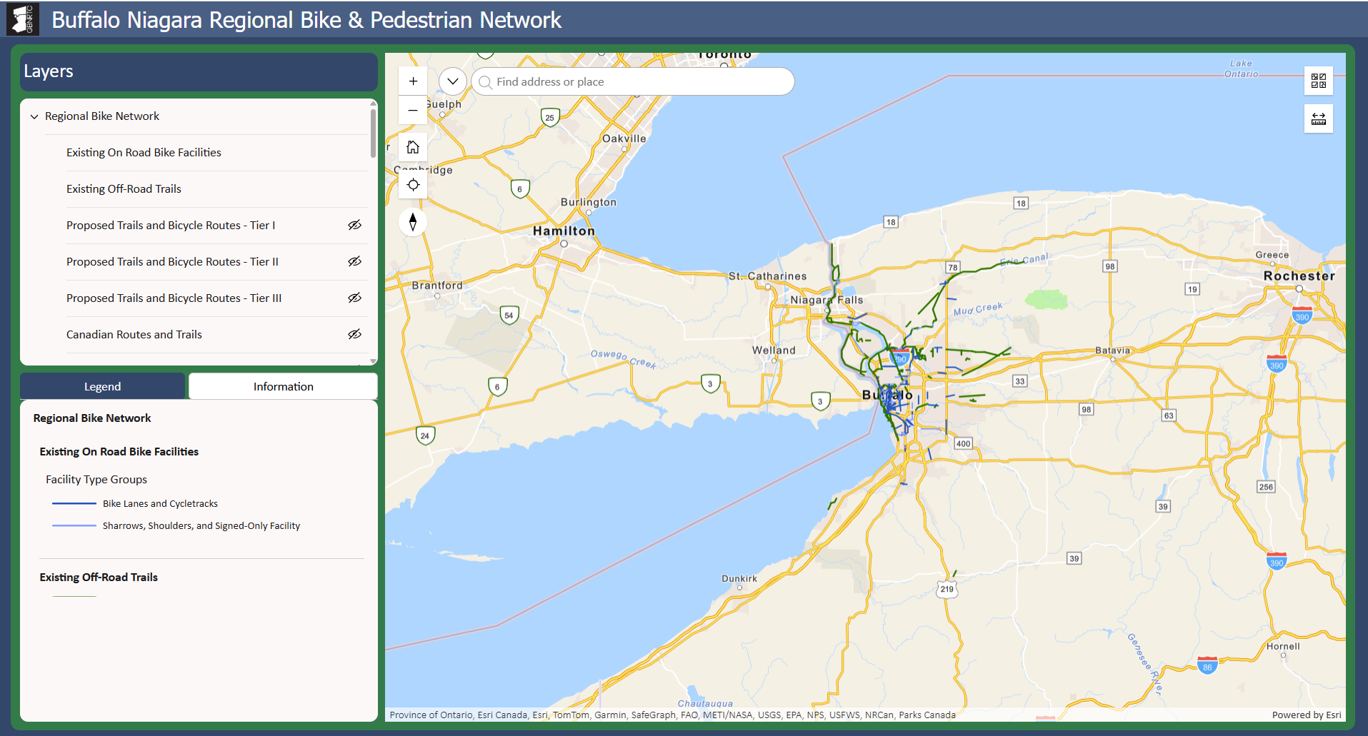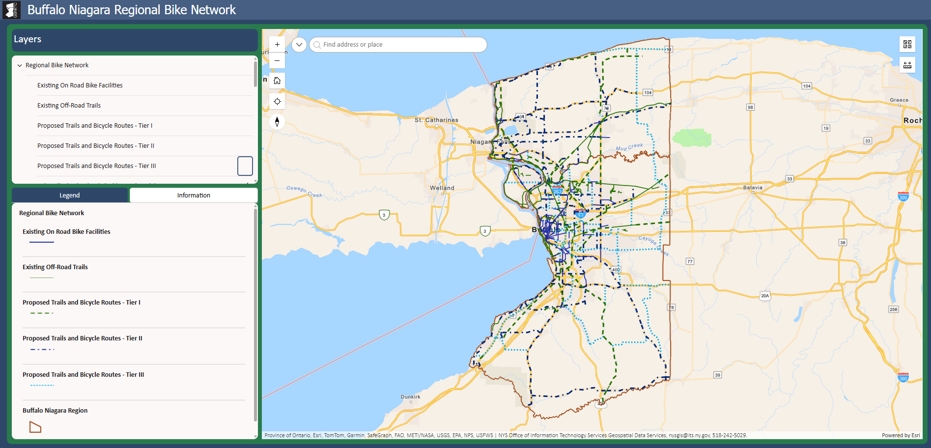 Explore Buffalo Niagaraβs bike network with this interactive map. View existing on- and off-road bicycle infrastructure, proposed bike infrastructure from the Regional Bike Master Plan, and other bike related information such as destinations, bike racks, bike and pedestrian counts, and more.