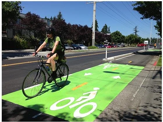 Dedicated lanes for bikes and micromobility devices that include a physical or painted buffer to separate cyclists from vehicle traffic or parked cars.