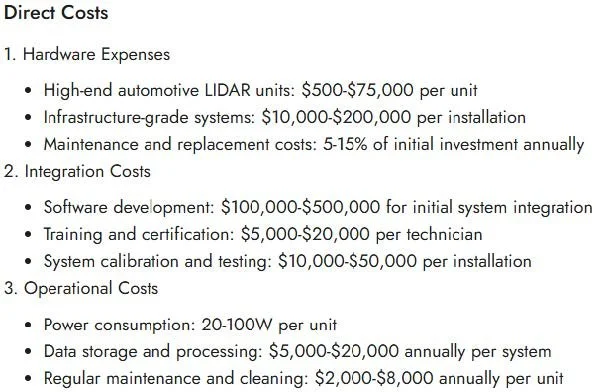 V2I (Vehicle-to-Infrastructure): Uses roadside units (RSUs) costing approximately $36,500 to $52,000 per kilometer. V2V (Vehicle-to-Vehicle): Components cost around $350 per vehicle (as of 2020), with prices expected to decrease as the technology advances.
