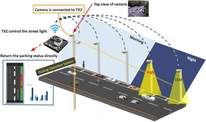 Modern streetlights equipped with technologies like cameras, light sensors, and Internet of Things (IoT) connectivity. These smart lights adjust illumination based on local conditions to enhance safety and save energy.